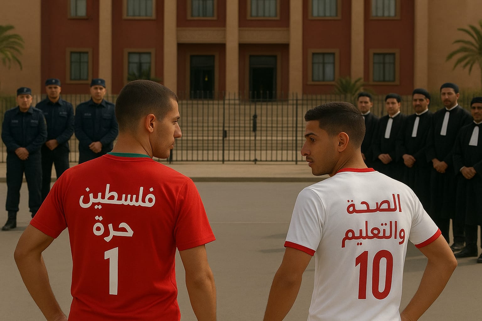 قضت المحكمة الابتدائية بالرباط، في ساعة متأخرة من ليلة أمس، بأحكام حبسية في حق شابين ارتديا أقمصة تحمل شعارات تضامنية من قبيل * فلسطين حرة ” و “المطالبة بالصحة والتعليم”، وذلك عقب جلسة مطوّلة شهدت مرافعات قانونية ونقاشات حامية بين الدفاع والنيابة العامة.