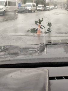واستنكر أحد النشطاء في مقطع فيديو عدم إتمام الأشغال على مستوى شارع كاراج زرياح، الواقع بحي المصلى، وهو ما تسبب في عرقلة السير جراء تجمع مياه الأمطار في مساحة كبيرة.