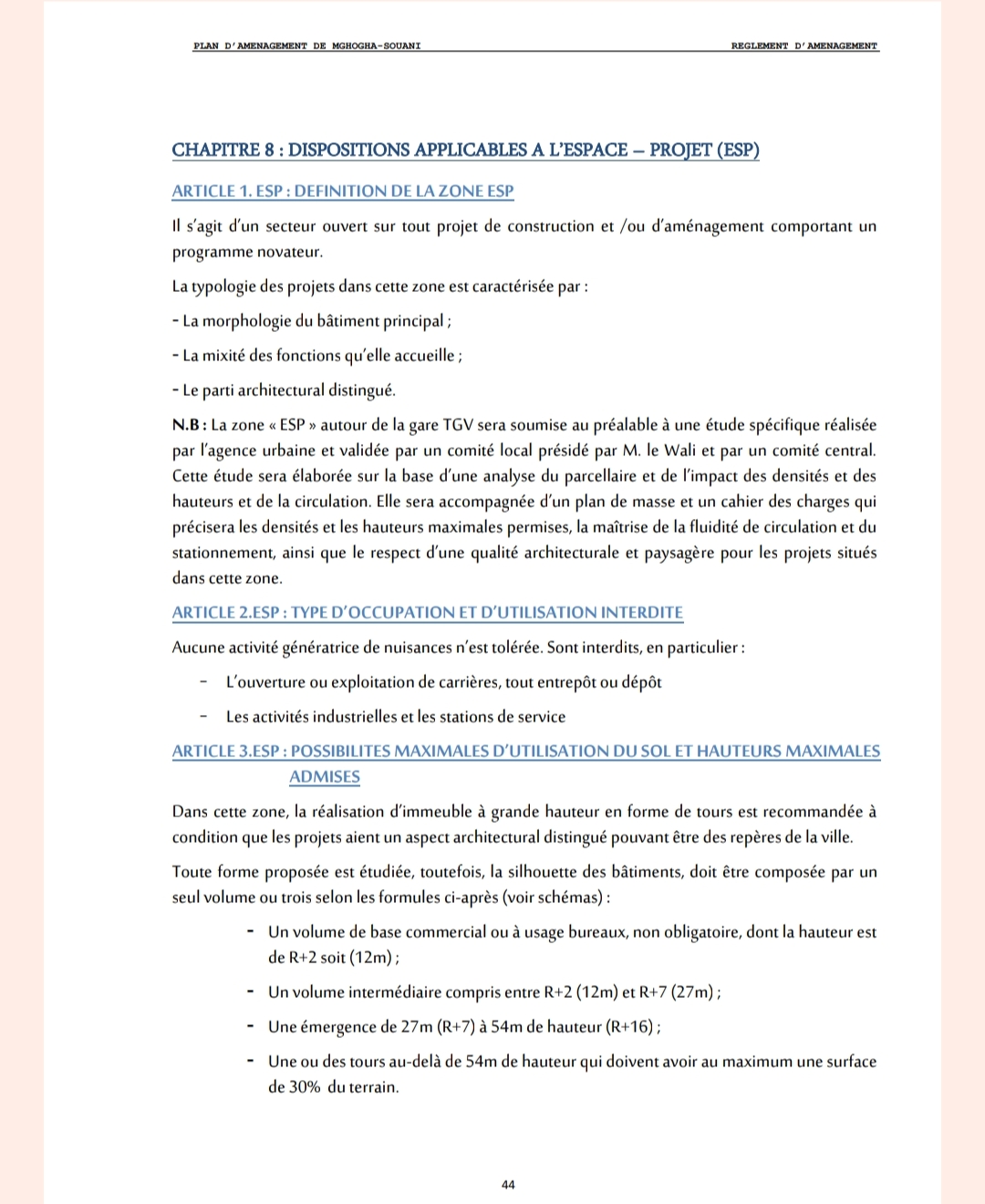 هذا وتجدر الإشارة إلى أنه بالنسبة لمنطقة المشاريع ESP” ، التي تمتد على مساحة تناهز 65 هكتارا حول محطة القطار فائق السرعة، والتي تعتبر قطبا حضريا ذا إمكانيات اقتصادية عالية، فقد اعتمدت الدراسة على تحليل معمق للبنية العقارية وتأثير الكثافات العمرانية والعلو المسموح به، مع وضع ضوابط عمرانية دقيقة تضمن انسيابية حركة السير والجولان، وتحقيق انسجام وظيفي ومعماري بين المباني والفضاءات العامة، بما يعزز جاذبية المنطقة للاستثمار الوطني والدولي.