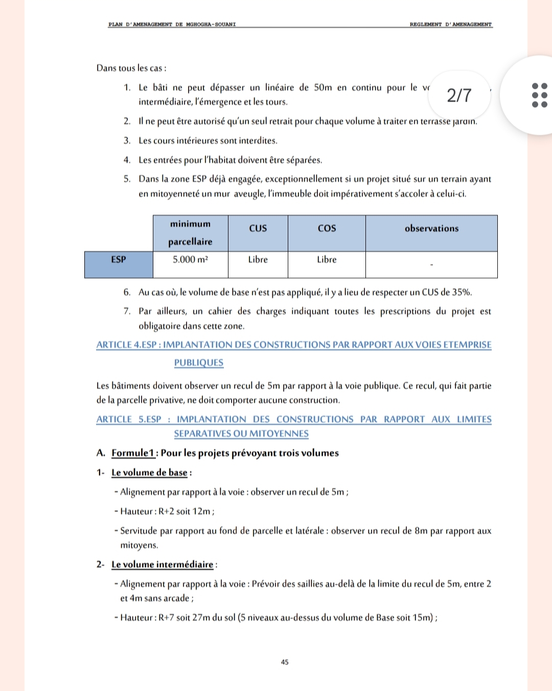 وسيكون بإمكان المنعشين العقاريين، الذين يتوفرون على الأراضي في منطقة ESP والتي تعني espace de grand projet، أن يستشرفوا رؤية واضحة حول المشاريع العقارية، من حيث العلو وعدد الطوابق وفق القواعد التقنية المنصوص عليها “علو بلا حدود”، و 54 مترا في الهواء كحد أدنى، وذلك بشرط أن لا تقل القطعة الأرضية على 5000 آلاف متر مربع.