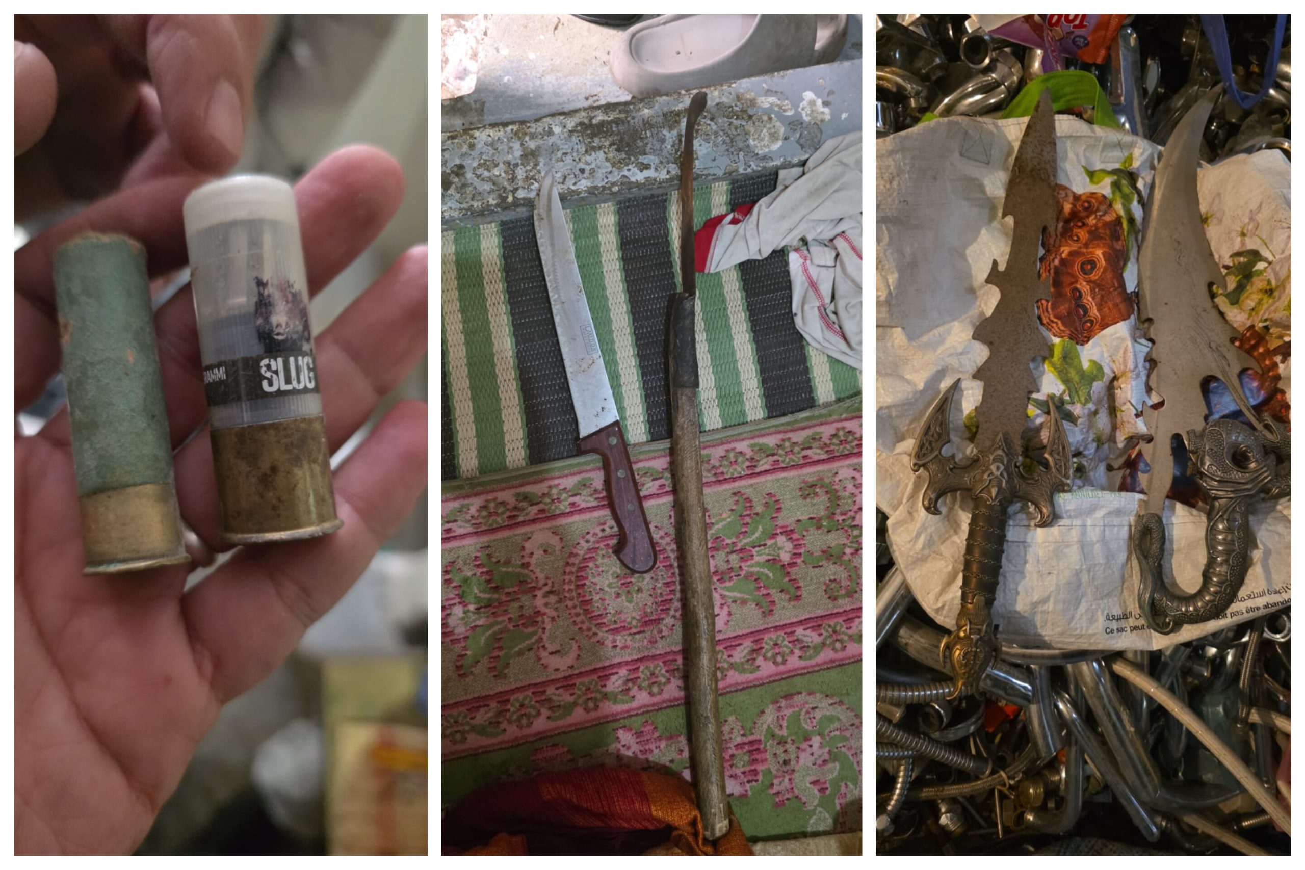 التحريات التي باشرتها ولاية أمن طنجة أسفرت عن تحديد مكان تواجد المتهم وتوقيفه، قبل مباشرة عملية تفتيش داخل المنزل الذي يقطنه لوحده، وهو مسكن من طابقين بحي برواقة في بنديبان ، حيث سبق أن اكتراه قبل أن يشتريه لاحقاً. وقد أسفرت العملية عن العثور على مجسم يشبه قذيفة، وخرطوشتين خاصتين ببندقية صيد، وخمس أسلحة بيضاء، وجهاز لاسلكي، وثلاث عبوات غاز مسيل للدموع.