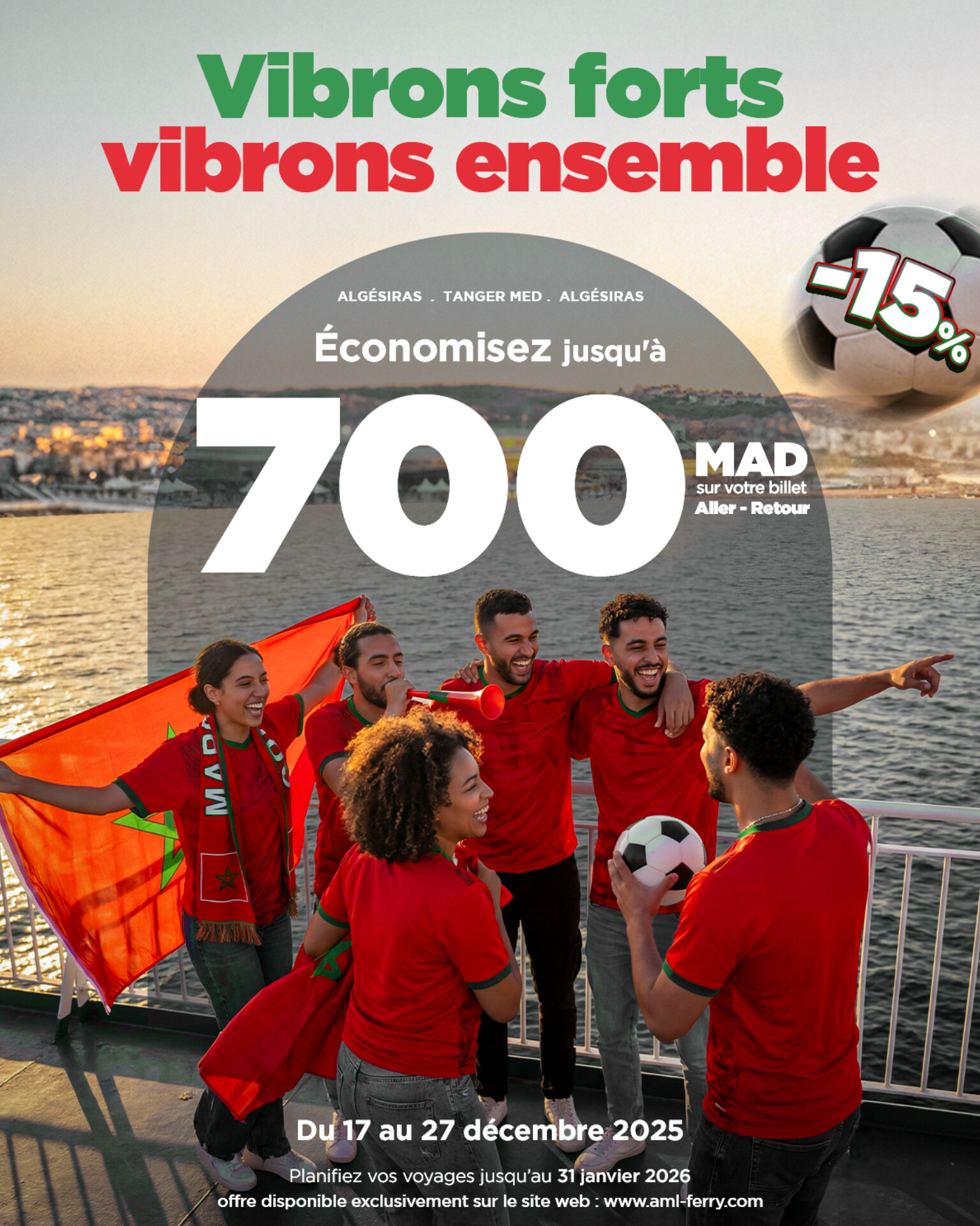 أطلقت شركة AML للنقل البحري، منذ أول أمس الأربعاء، عرض ترويجي خاص لفائدة زبنائها، يمتد من 17 إلى 27 دجنبر 2025، ويهم الرحلات البحرية ذهابًا وإيابًا بين ميناء الجزيرة الخضراء وميناء طنجة المتوسط.