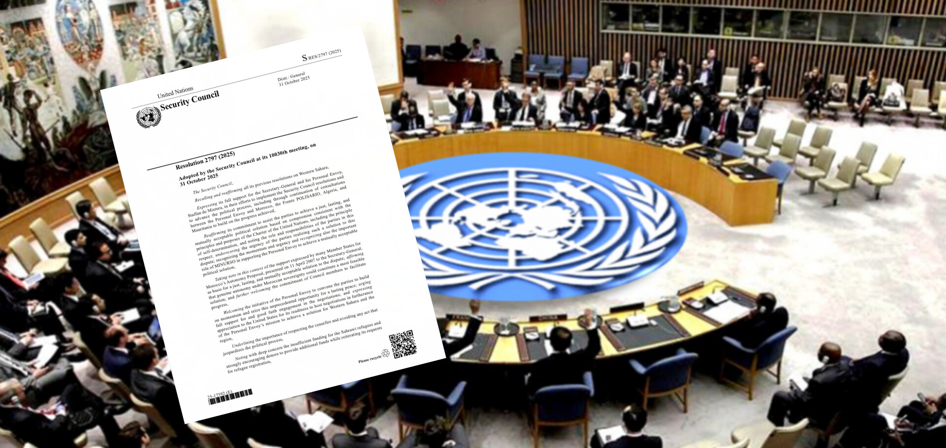 تم عشية يوم الثلاثاء نشر القرار الجديد لمجلس الأمن رقم 2797 على الموقع الرسمي للأمم المتحدة، القرار الذي حمل عبارات تؤكد ان خيار الحكم الذاتي تحت السيادة المغربية اصبح الصيغة الوحيدة المعتمدة في دواليب الأمم المتحدة .