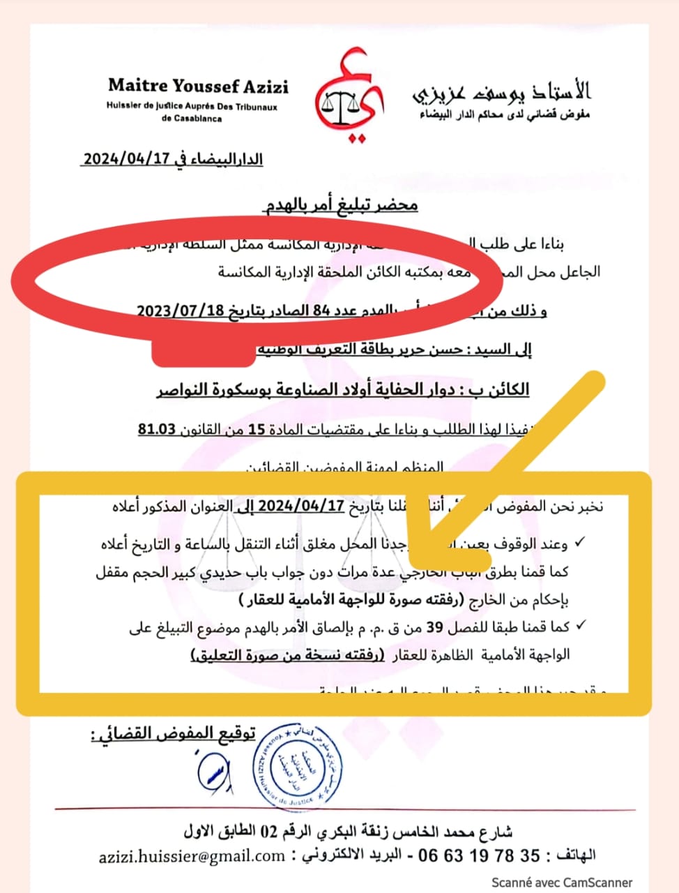وعكس ما روجه المعني بالأمر من أن السلطات فاجأته في توقيت تنفيذ عملية الهدم، ولم تبلغه قبل ذلك، فإن الوثيقة أعلاه، عن طريق المفوض القضائي، تبين كيف أن مصالح إنفاذ القانون تسعى بكل الوسائل القانونية الممكنة لتليغ المعني بالأمر، وتم تعليق مرة أخرى طبقا لقانون المسطرة المدنية نسخة من محضر تبليغ الأمر بالهدم، في الواجهة الأمامية للورش، وذلك بتاريخ أبريل سنة 2024.
